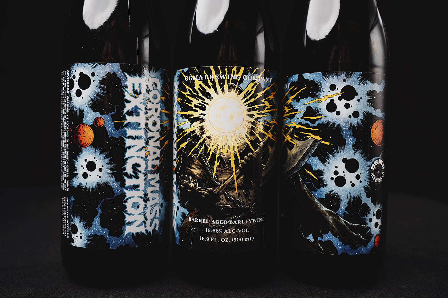 Coronal Mass Extinction barleywine returns from the abyss with even deeper fury. First aged in Buffalo Trace barrels, this single malt barleywine was then split and laid to rest in apple brandy and Valentines distilling bourbon casks for an additional nine months. The result is a celestial collision of spirit-soaked malt, radiant with waves of brandy-kissed fruit, bourbon heat, and the shimmer of toasted coconut and Taiwan vanilla. Each sip is molten and inexorable—sweetness and darkness spiraling together like collapsing stars. Decadent, radiant, and apocalyptic in its beauty, this is extinction made eternal.